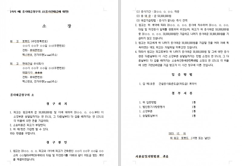 [서식 예] 공사대금청구의 소(공사잔대금에 대한)